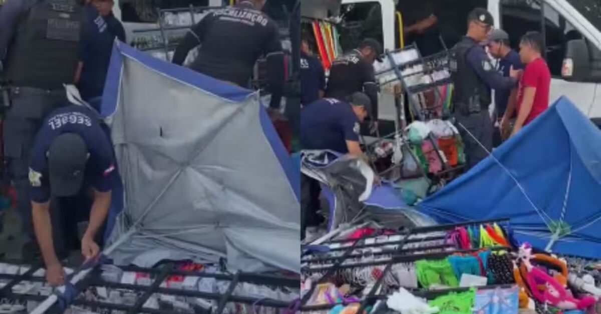 Imagens gravadas por um dos trabalhadores mostram estruturas metálicas, guarda-sóis e produtos religiosos, como terços e fitinhas do Círio de Nazaré, sendo recolhidos. Em um trecho do vídeo, um fiscal aparece tentando fechar um guarda-sol, que acabou rasgando durante a ação.