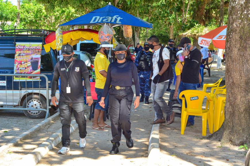 Durante todo o sábado, 18, a Prefeitura de Belém por meio da Ordem Pública atuou nas praias do Distrito de Outeiro fiscalizando os estabelecimentos quanto ao cumprimento dos protocolos sanitários descritos no Decreto Municipal n. 96.699 de 8 de julho de 2020, que determina normas para o combate à proliferação da Covid-19 nos balneários e praias da capital.