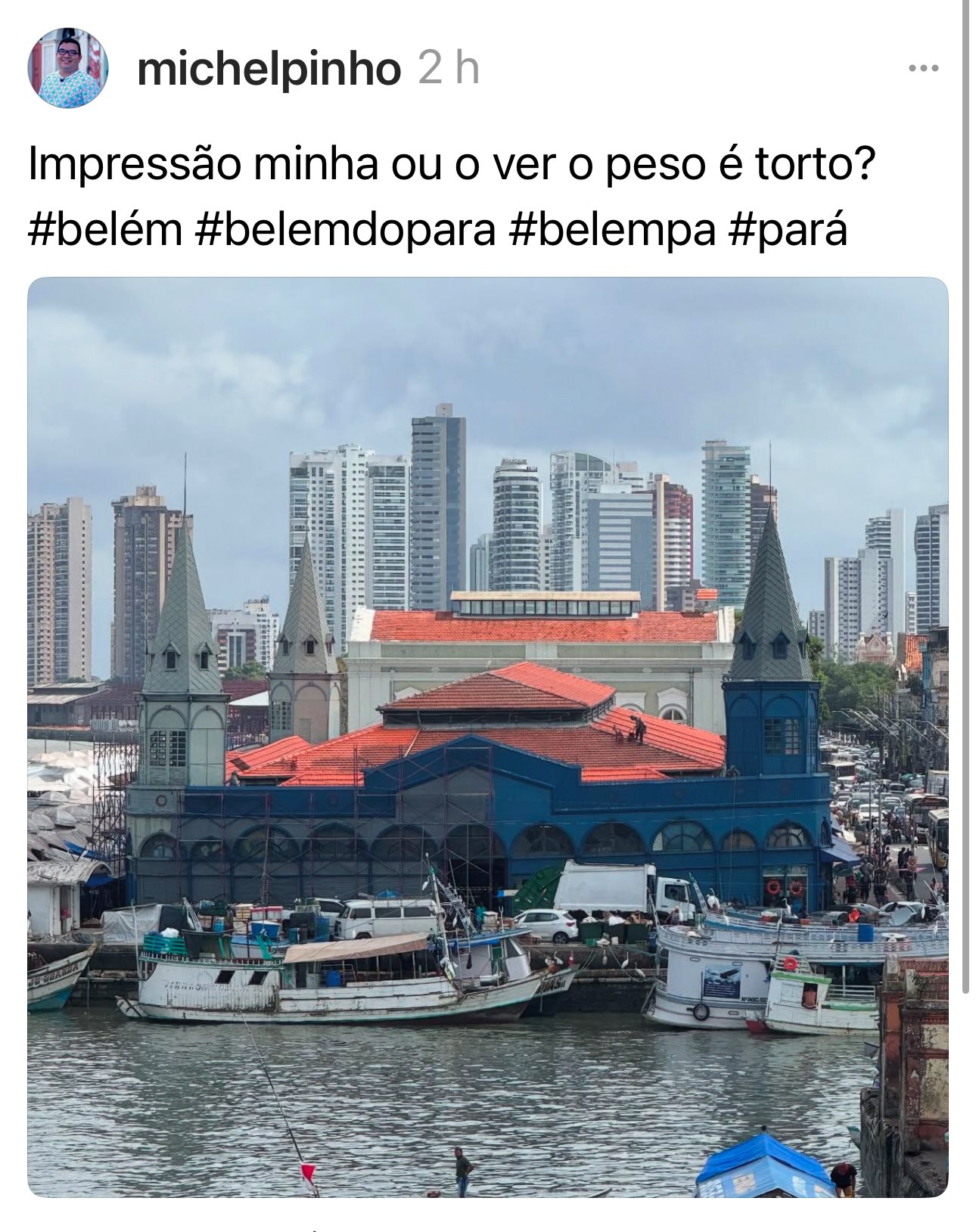 Uma foto publicada pelo professor e historiador Michel Pinho no X (antigo Twitter) levantou um debate inusitado sobre o famoso Mercado do Ver-o-Peso, em Belém. A imagem, capturada a partir do Forte do Castelo, apresenta o mercado sob um ângulo que sugere uma leve inclinação em direção à Baía do Guajará. Na legenda, Pinho provocou: “É impressão minha ou o Ver-o-Peso é torto?”