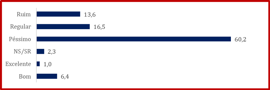 Doxa perguntou “qual a avaliação que você faz do governo do prefeito Edmilson Rodrigues?”. O resultado mostra uma avaliação positiva de 7,4% (somatória de Bom e Excelente). Já a avaliação negativa chega a 73,8% (somatória de Péssimo e Ruim). A avaliação regular ficou em 16,5%.