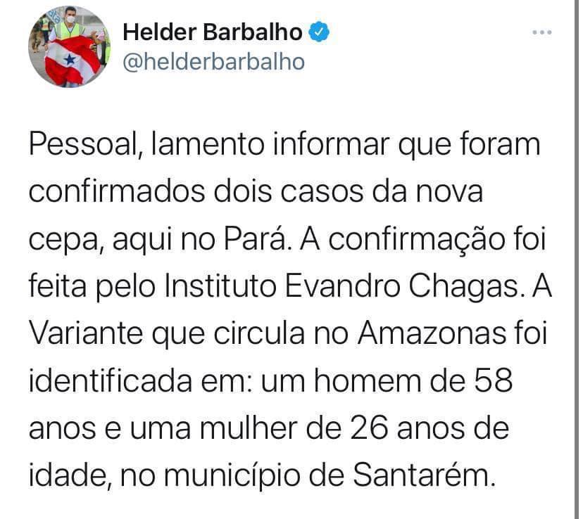 Duas infecções pela mais recente variante identificada do novo coronavírus em Manaus (AM) foram confirmadas no estado do Pará. A informação foi divulgada na sexta-feira, 29, pelo governador Helder Barbalho. A nova cepa que circula no Amazonas foi detectada em um homem de 58 anos e uma mulher de 26 anos, ambos residentes em Santarém, no oeste paraense. Os dois pacientes já receberam tratamento e se encontram estáveis.
