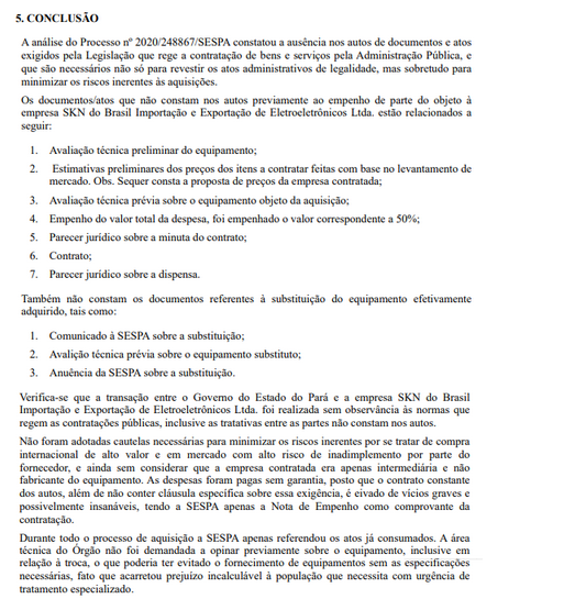 “Verifica-se que a transação entre o governo do Pará e a empresa S do Brasil foi realizada sem observância às normas que regem as contratações públicas. Não foram adotadas cautelas necessárias para minimizar os riscos inerentes por se tratar de compra internacional de alto valor e em mercado com alto risco de inadimplemento por parte do fornecedor, e ainda sem considerar que empresa contratada era apenas intermediária.”