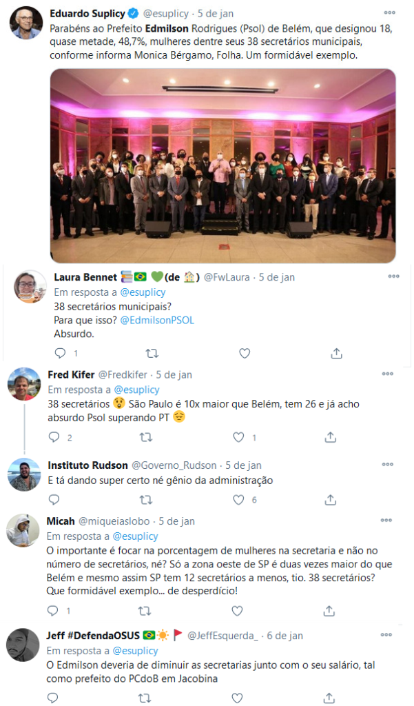 Eduardo Suplicy, em uma rede social, ao elogiar a composição do secretariado de Edmilson foi bastante questionado até por seus seguidores.