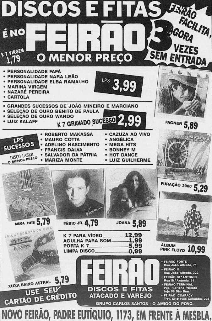 E Belém teve diversas lojas de discos que fizeram parte da história da cidade. Lojas como Avistão, Mesbla, Gramophone, Lado A, Gato na Tuba, Person, Aky-disco – “com 12 lojas e mais um deposito na Praça da Bandeira” -, Feirão, Tok-disco, The Musical, Radiolux, entre outras.