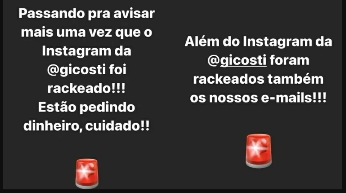 O meia Paulo Henrique Ganso, do Fluminense, denunciou, ontem à noite, nas redes sociais, que um hacker roubou a conta do Instagram de sua esposa, Giovanna Costi, e os e-mails deles, e estava pedindo dinheiro para pessoas que ela tinha contato.