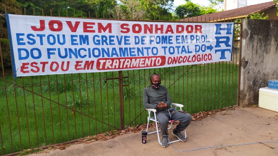 Ontem um homem de 50 anos, identificado Antônio Dias, mais conhecido como jovem sonhador, iniciou uma greve de fome em frente ao Hospital Regional do Tapajós (HRT). Acorrentado pelas pernas e com uma faixa de protesto, Antônio pede que a Unidade seja inaugurada em sua totalidade de atendimentos e serviços.