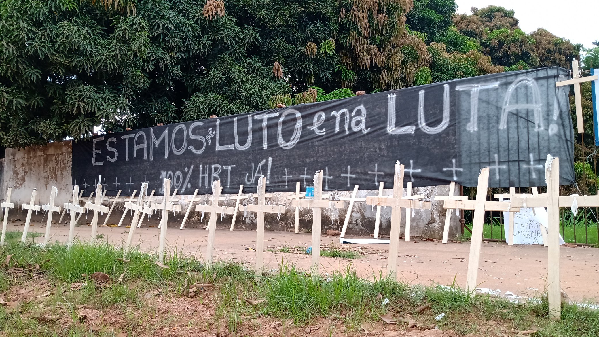 Os moradores fincaram cruzes na frente do hospital simbolizando cada uma das vítimas por Covid-19 na região.