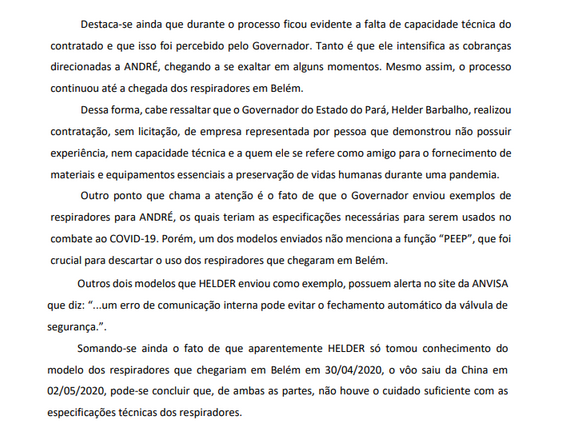 “Outro ponto evidenciado pelas mensagens é a falta de experiência e conhecimento de André para realizar a operação. Tanto é que Helder precisa intervir” para agilizar a liberação do equipamento na China, o transporte e até a entrega. “Pode-se concluir que, de ambas as partes, não houve o cuidado suficiente com as especificações técnicas dos respiradores.”