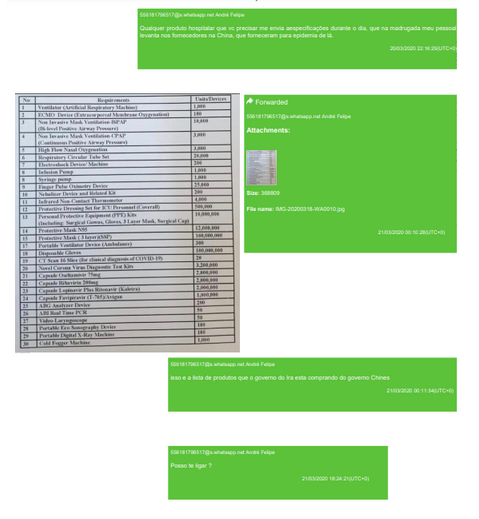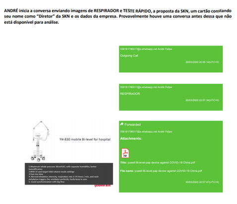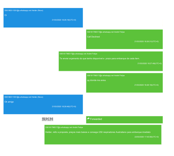 André quem envia a primeira mensagem, com o nome de “Diretor da SKN” e escreve: “Qualquer produto hospitalar que vc precisar me envia aespecificações (SIC) durante o dia que na madrugada meu pessoal levanta nos fornecedores na China, que fornecem para epidemia de lá”