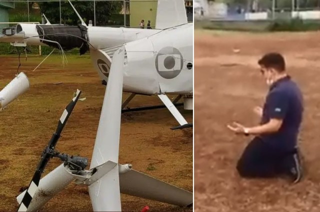 Helicóptero da Globo faz pouso forçado e perde cauda; piloto reza após aterrissagem