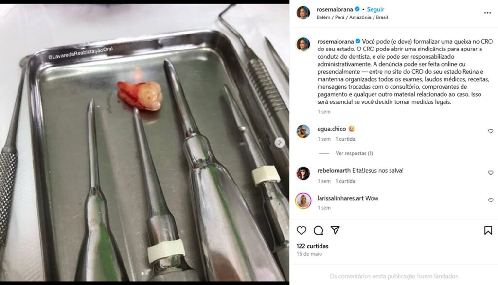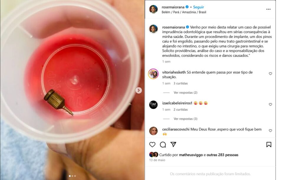 Rose Maiorana, diretora comercial e artista plástica, afirma ter engolido peça metálica durante procedimento odontológico em clínica de Belém. Caso gerou cirurgia de emergência e é contestado judicialmente pela clínica.