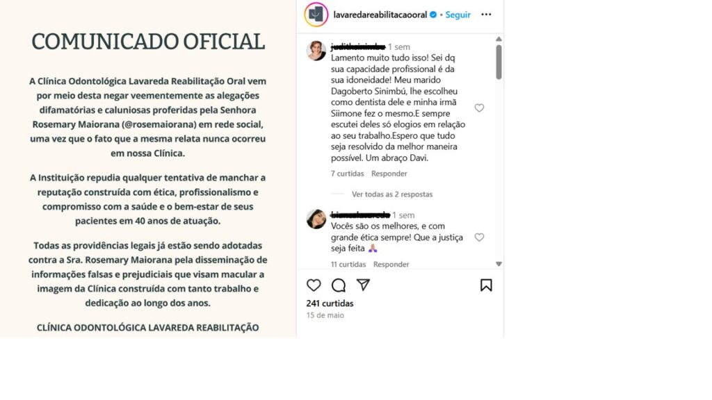 “Minha intenção nunca foi difamar ou caluniar, mas sim alertar outros pacientes e buscar meus direitos após uma situação extremamente grave. Tenho como comprovar minha presença na clínica e os efeitos do ocorrido”, afirmou Rose.