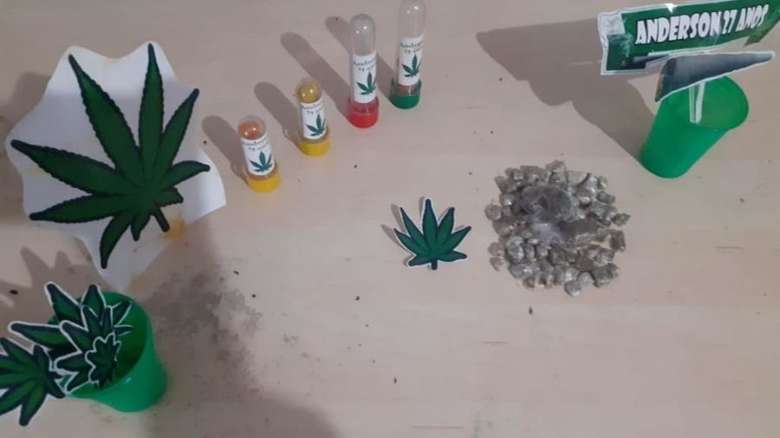 Na casa de Anderson, os policiais apreenderam 50 papelotes de maconha, além dos brindes e objetos decorativos alusivos à maconha — entre eles, potes de bombons, que podem ter sido produzidos com a droga. Com Anderson, os policiais apreenderam apenas 30 papelotes da droga.