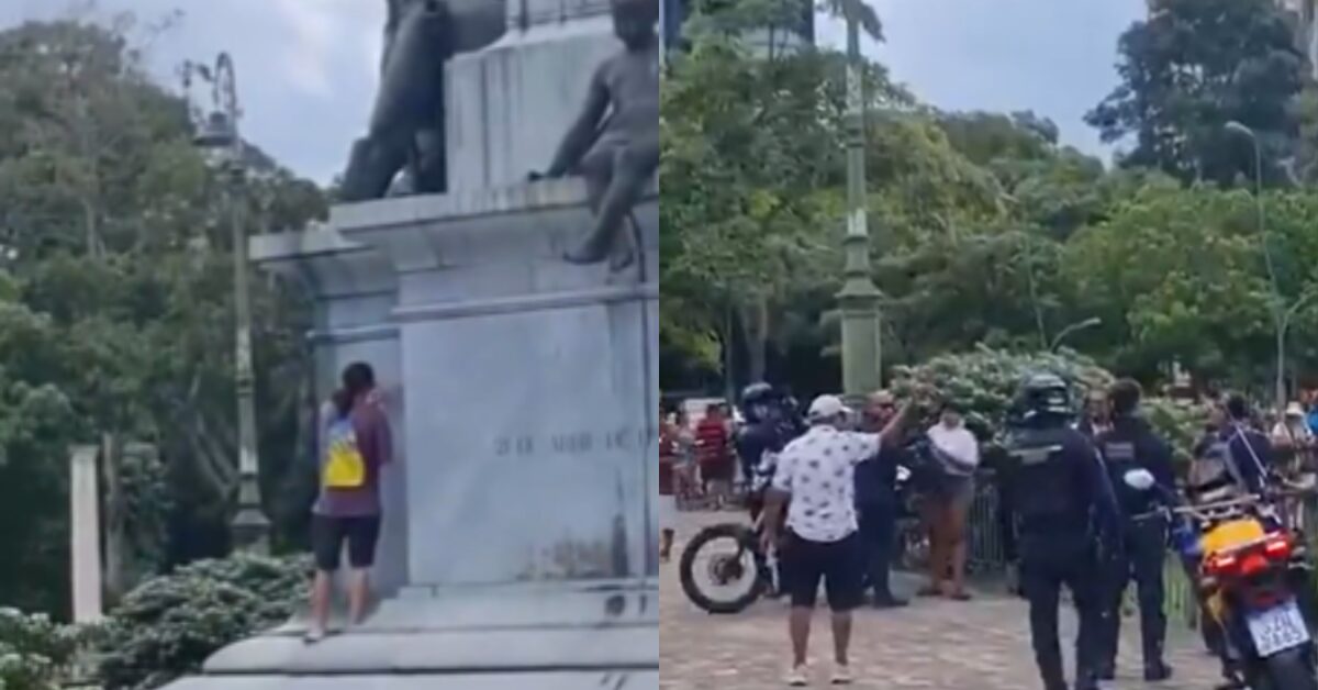 Dois homens foram flagrados neste domingo (29) pichando um monumento na Praça da República, no centro de Belém. Eles foram abordados por agentes da Guarda Municipal.