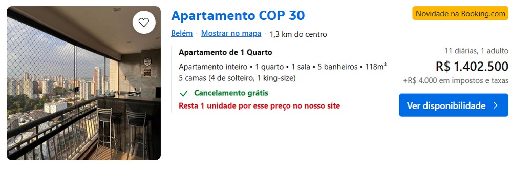 A um ano da COP 30, prevista para novembro de 2025 em Belém, os preços de hospedagem na capital paraense já alcançam cifras milionárias. Anúncios recentes em plataformas como o Booking.com oferecem pacotes que chegam a R$ 1,8 milhão por 11 noites, com diárias superiores a R$ 127 mil por pessoa.
