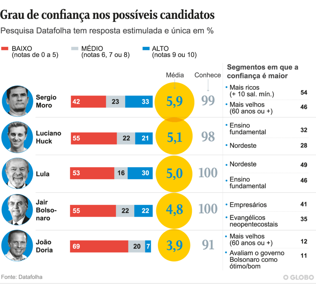 A despeito da força do Planalto, pesquisas divulgadas neste início de ano, especialmente uma do Datafolha de janeiro, animaram Huck e o seu entorno. Em um índice de confiabilidade de figuras públicas brasileiras, o apresentador apareceu na frente do governador de São Paulo, João Doria, com ativos eleitorais que há tempos os tucanos encontram dificuldades de ter: entrada no Nordeste e na população de baixa instrução.