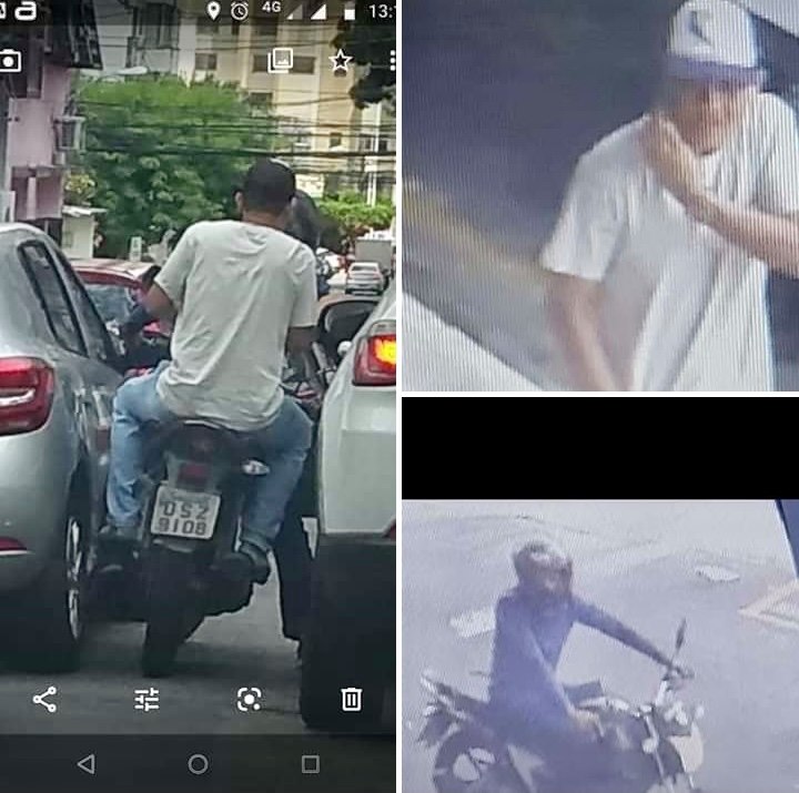 Em outra imagem aparece o comparsa em uma moto. Em outra imagem os dois aparecem fugindo na moto. É possível identificar a placa da moto.