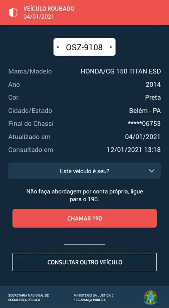 A moto usada na fuga é roubada, de acordo o sistema da secretaria nacional de segurança pública.
