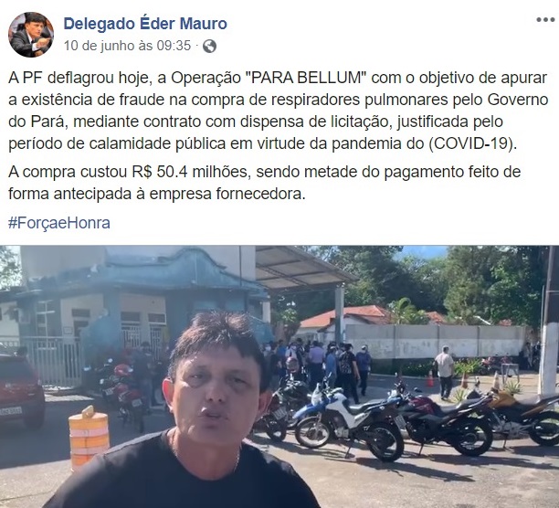Mas antes das exonerações, Éder Mauro publicou uma postagem no Facebook, na qual fala sobre a operação Para Bellum, da Polícia Federal, que investiga a compra de respiradores da China pelo Governo do Estado. Na postagem, Éder Mauro relata o que acabara de acontecer, com a PF fazendo buscas e apreensões na sede do Governo do Pará.