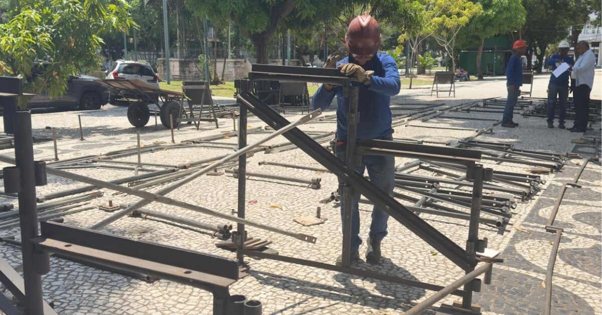 A montagem das arquibancadas teve início nesta terça-feira (9), na avenida Presidente Vargas, sob responsabilidade da Loc Engenharia. A estrutura contará com área de alimentação, estandes de artesanato religioso e banheiros, além de passar por vistoria do Corpo de Bombeiros antes da liberação ao público.