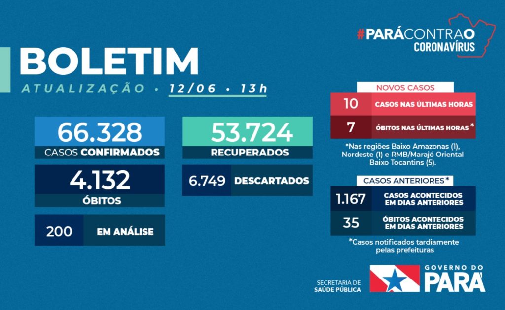 Com essas atualização, agora, são 66.328 casos e 4.132 óbitos no Pará. O detalhamento de casos e óbitos, com gênero, idade e cidade, está disponível aqui: http://covid-19.pa.gov.br.