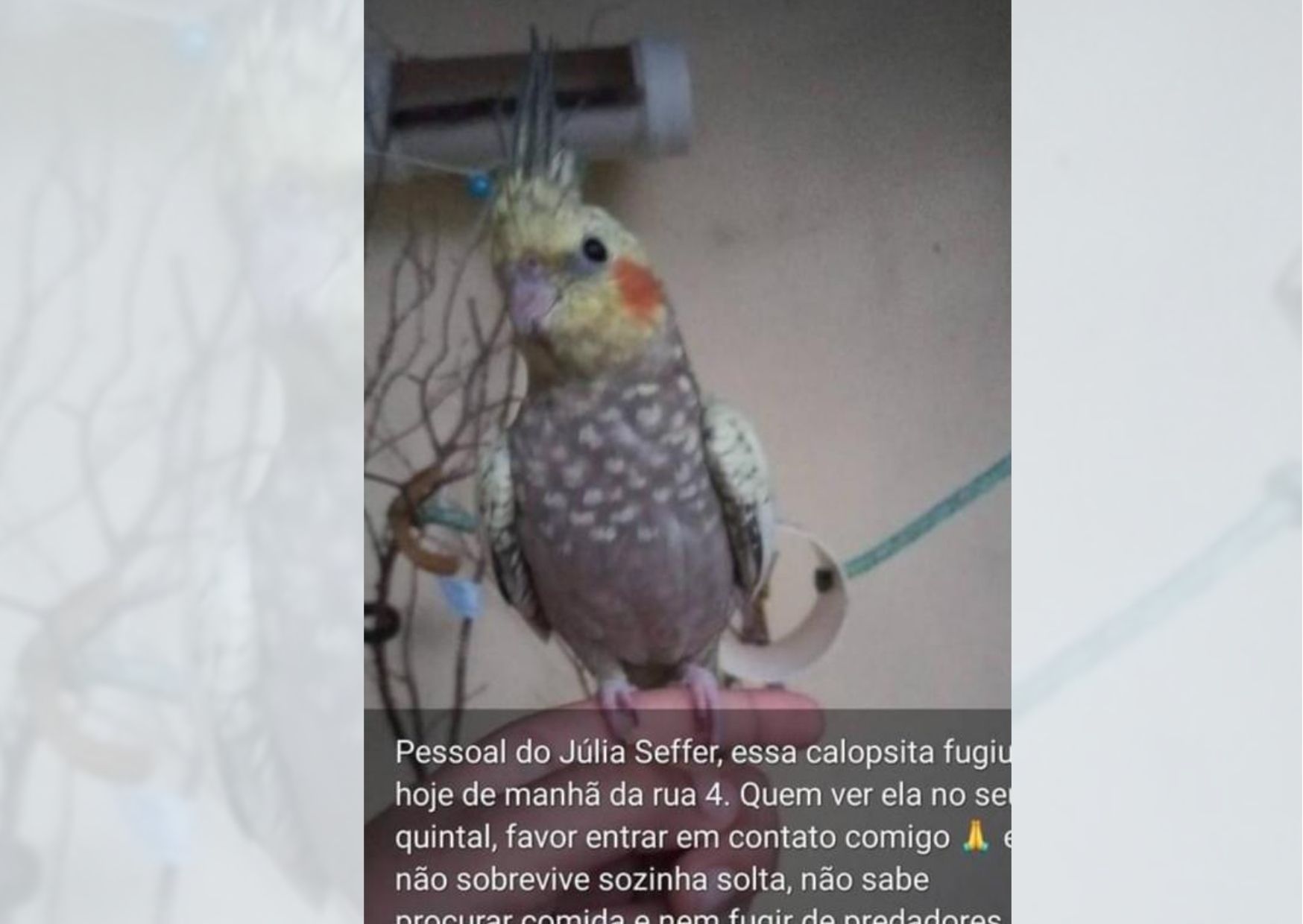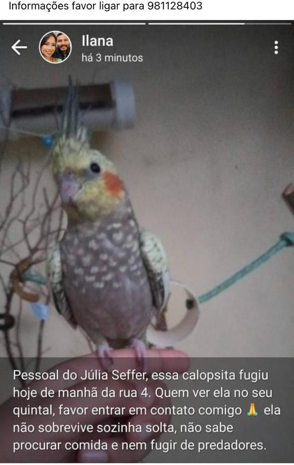 Através das redes sociais, uma internauta compartilhou nesta semana, a foto de uma calopsita, que fugiu de sua residência. “Pessoal do Júlia Seffer, essa calopsita fugiu hoje de manhã da rua 4. Quem ver ela no seu quintal, favor entrar em contato comigo”, diz a dona do animal.