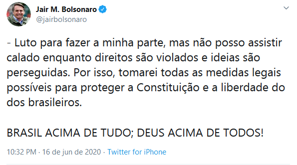 Na rede social, o presidente disse que “os abusos presenciados por todos nas últimas semanas foram recebidos pelo governo com a mesma cautela de sempre, cobrando, com o simples poder da palavra, o respeito e a harmonia entre os poderes”.