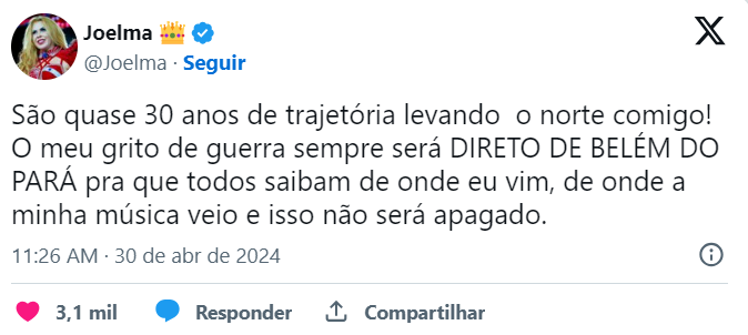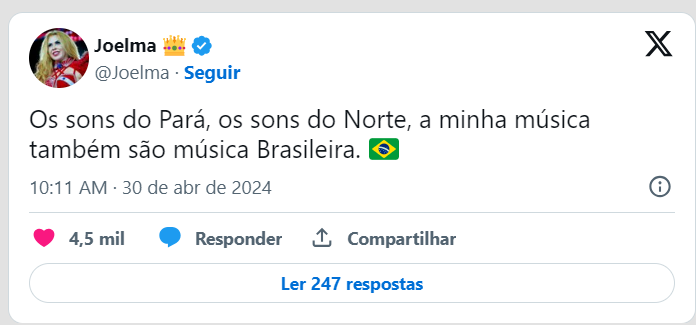 Joelma, outra artista paraense, se manifestou no Twitter. Ela lembrou sua trajetória de quase 30 anos de carreira levando o som do Norte para o restante do Brasil, enfatizando a relevância da cultura paraense para a música brasileira: “Os sons do Pará, os sons do Norte, a minha música também são música Brasileira. […] O meu grito de guerra sempre será DIRETO DE BELÉM DO PARÁ pra que todos saibam de onde eu vim, de onde a minha música veio e isso não será apagado”.