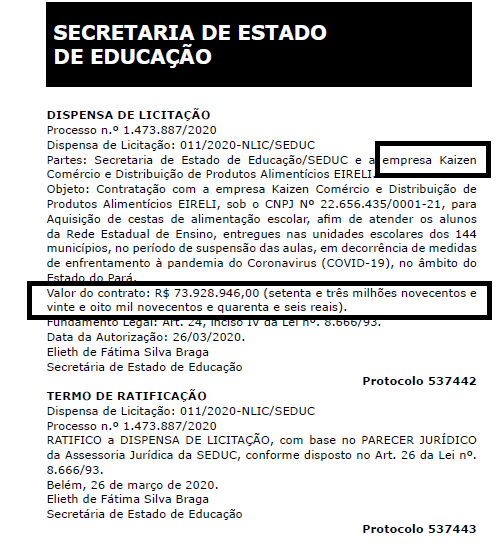 Mas o que faz essa empresa Kaizen? A Kaizen fez negócios várias vezes com o Governo do Estado, mas nunca em um contrato de valor tão alto. Ainda neste ano, a Kaizen fez outro contrato com a Fundação de Atendimento Socioeducativo do Pará (Fasepa), no valor de R$ 72 mil, em março de 2020.