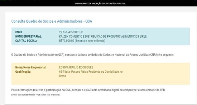 Atividades secundárias – Uma consulta ao Cadastro Nacional de Pessoa Jurídica mostra que a Kaizen tem 20 atividades econômicas secundárias, e não apenas a de fornecer alimentos. As atividades eram as mais variadas e iam de comércio de veículos, a comercialização de sementes e flores, passando artigos de armarinho, de medicamentos e materiais de uso médico e outros mais diversos.