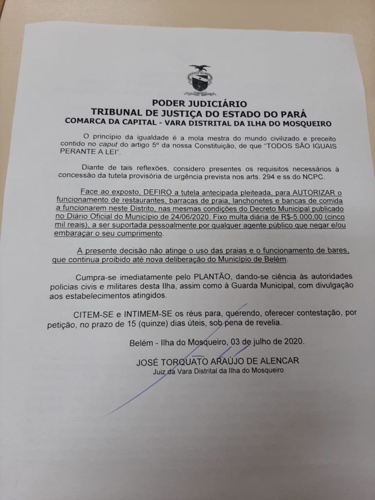 O juiz José Torquato Araújo de Alencar, titular da Vara Distrital da Ilha de Mosqueiro, concordou com os argumentos do MPE, deferiu a liminar com base no princípio da igualdade, e autorizou a abertura de restaurantes, lanchonetes e barracas de comida na ilha.