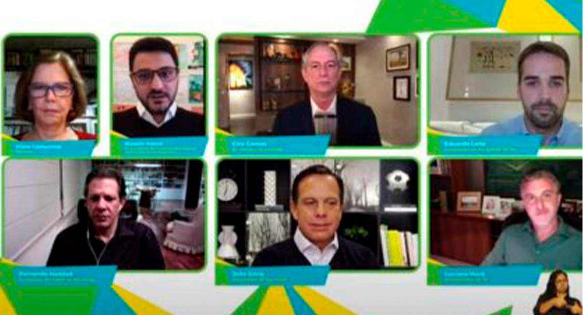 Cinco dos pré-candidatos ao Planalto para 2022, quais sejam: João Dória, governador de São Paulo, Eduardo Leite, governador do Rio Grande do Sul, Ciro Gomes, ex-ministro da Fazenda, e Luciano Huck, apresentador de televisão, além de Fernando Haddad, ex-prefeito de São Paulo, participaram neste final-de-semana, pela primeira vez, de um encontro virtual para debater os desafios do Brasil após assinarem um manifesto conjunto em defesa da democracia, em 31 de março.