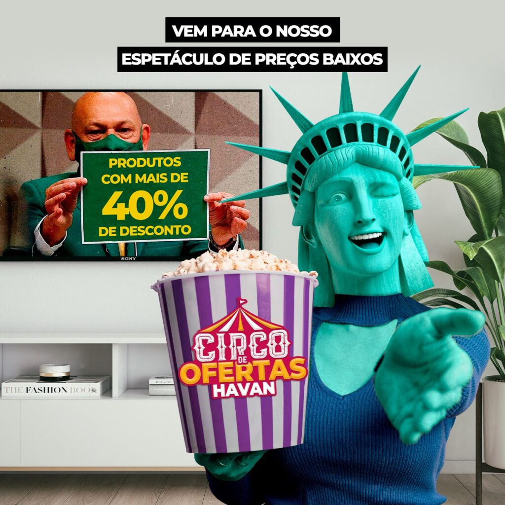 Em um dos memes, a famosa estátua da liberdade da Havan, aparece segurando pipoca com a frase escrita “circo de ofertas” enquanto no fundo está Luciano Hang em uma TV segurando uma placa escrito “Produtos com mais de 40% de descontos”.