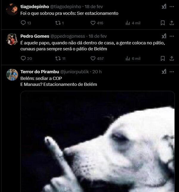 Os paraenses responderam com provocações, sugerindo que Manaus estaria reduzida ao papel de apoio para a capital paraense durante o evento. “Foi o que sobrou pra vocês: ser estacionamento”, afirmou um internauta. Outro comentou: “Quando não dá dentro de casa, a gente coloca no pátio. Cunaus para sempre será o pátio de Belém”.