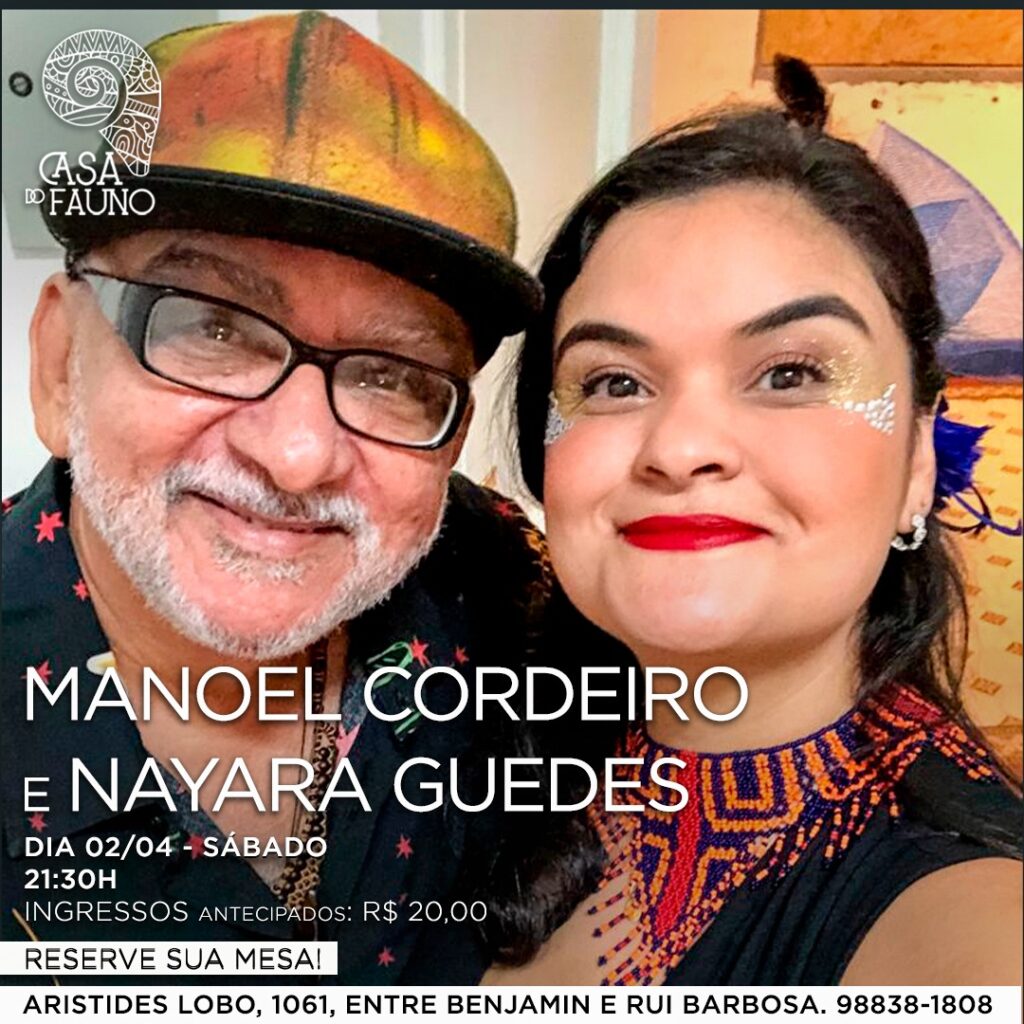 A cantora Nayara Guedes traz na bagagem uma mistura dos anos de música junto ao coro Carlos Gomes, das rodas de música da vida, e das andanças por este mundo afora. Já Manoel Cordeiro, dispensa apresentações, é um dos maiores nomes da música paraense.
