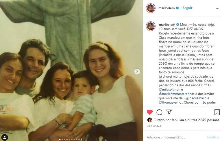 “Meu irmão, nosso anjo. 10 anos sem você. Dez anos. Recebi recentemente essa foto que a Cissa mandou em que minha foto ficava no mural do seu quarto (te mandei em uma carta quando morei fora), juntei aqui com outras fotos (inclusive a nossa última juntos com nosso pai e nossas irmãs em abril de 2010) em uma linha do tempo que se encerrou cedo demais para nós que tanto te amamos”, começou Maria ao dividir alguns cliques em família no Instagram.