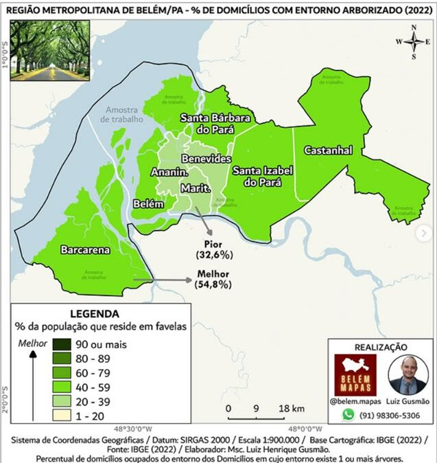 Belém, a capital, apresenta 45% de arborização no entorno dos domicílios. Ananindeua e Benevides também registram índices reduzidos, reforçando a falta de verde nas áreas urbanas da Grande Belém.