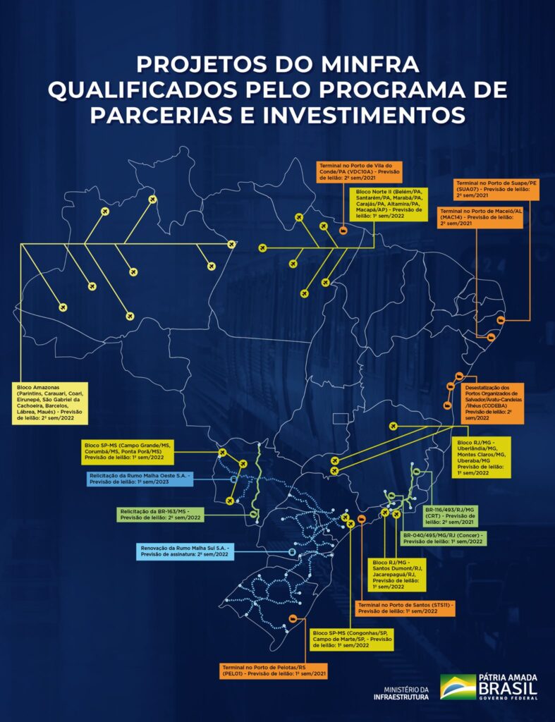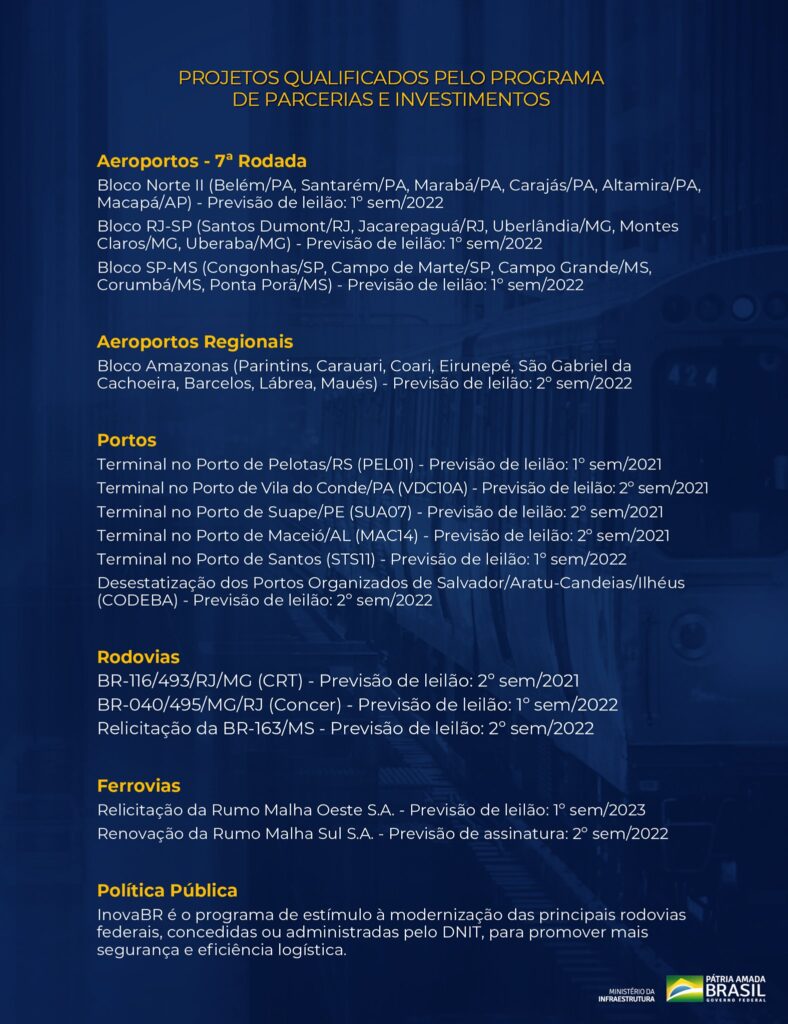 “Novidades do Ministério da Infraestrutura aprovadas hoje no Programa de Parcerias de Investimentos:- Concessão de +16 aeroportos incluindo Santos Dumont e Congonhas;- PPP de 8 aeroportos regionais na Amazônia (1ª PPPs aeroportuárias do Governo Federal)- Privatização dos portos da Bahia (Codeba)- Programa InovaBR (modernização tecnológica de rodovias)- Recuperação de ferrovias de Malha Oeste (relicitação) e Malha Sul (renovação)“, disse Tarcísio em suas redes sociais.