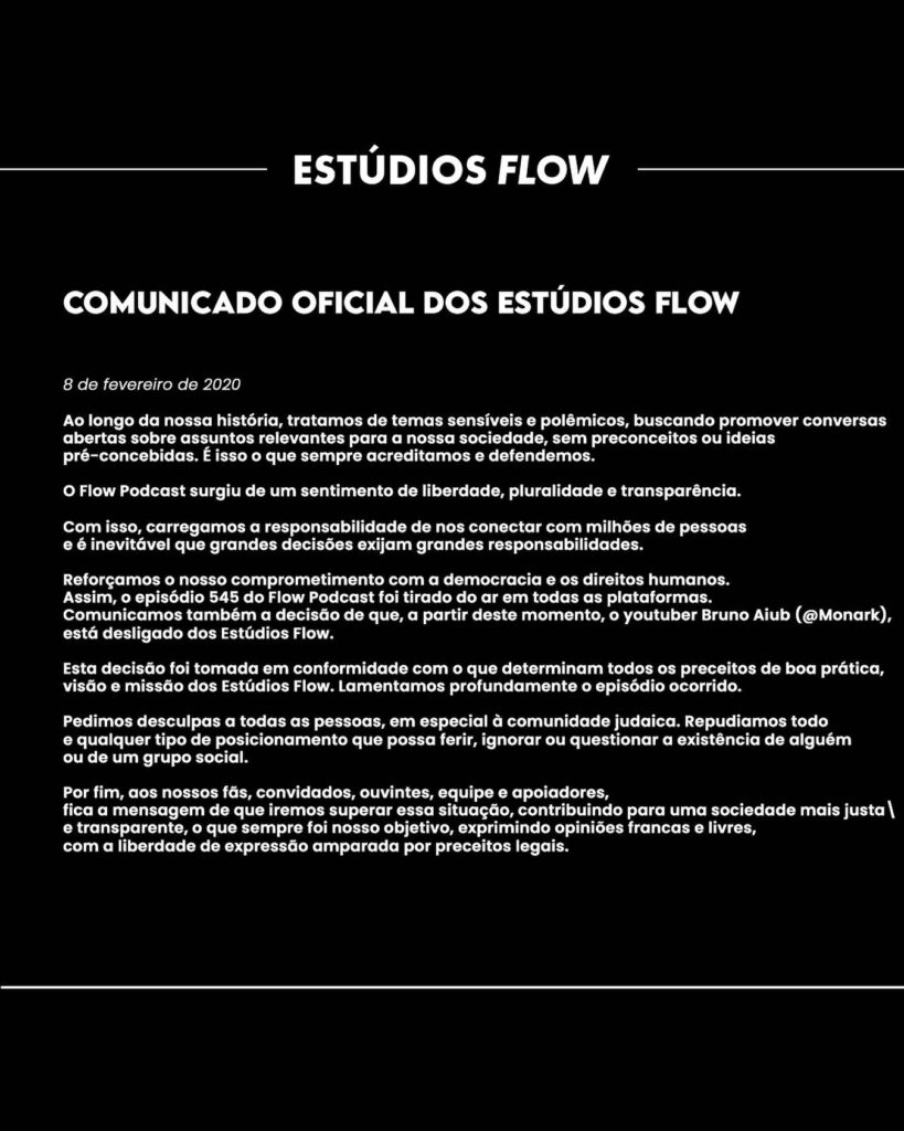 Em nota, os Estúdios Flow anunciaram a demissão do apresentador: “A partir deste momento, o youtuber Bruno Aiud está desligado dos Estúdios Flow […] Lamentamos profundamente o episódio ocorrido”. Veja texto completo: