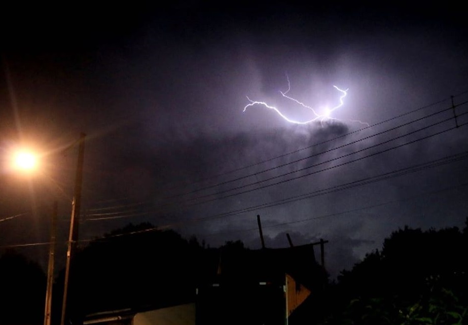 Segundo especialistas, 98% dos raios sobem da terra às nuvens; 1% dos raios caem das nuvens em direção ao solo e o outro 1% é o da imagem, são as descargas elétricas (raios) entre nuvens. O céu coberto de nuvens carregadas de chuvas, trouxe consigo vento forte e relâmpagos.