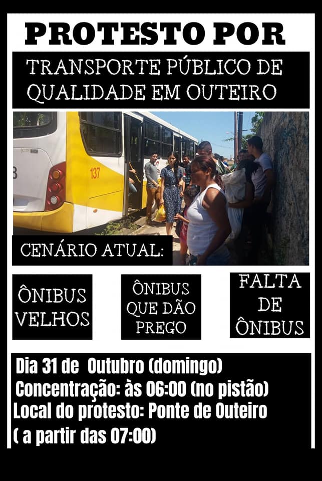 Cansados de esperar alguma solução da prefeitura de Belém para a situação caótica dos ônibus que atendem o Distrito de Outeiro, os moradores resolveram se organizar para fazer um protesto no próximo domingo, 31 de Outubro.