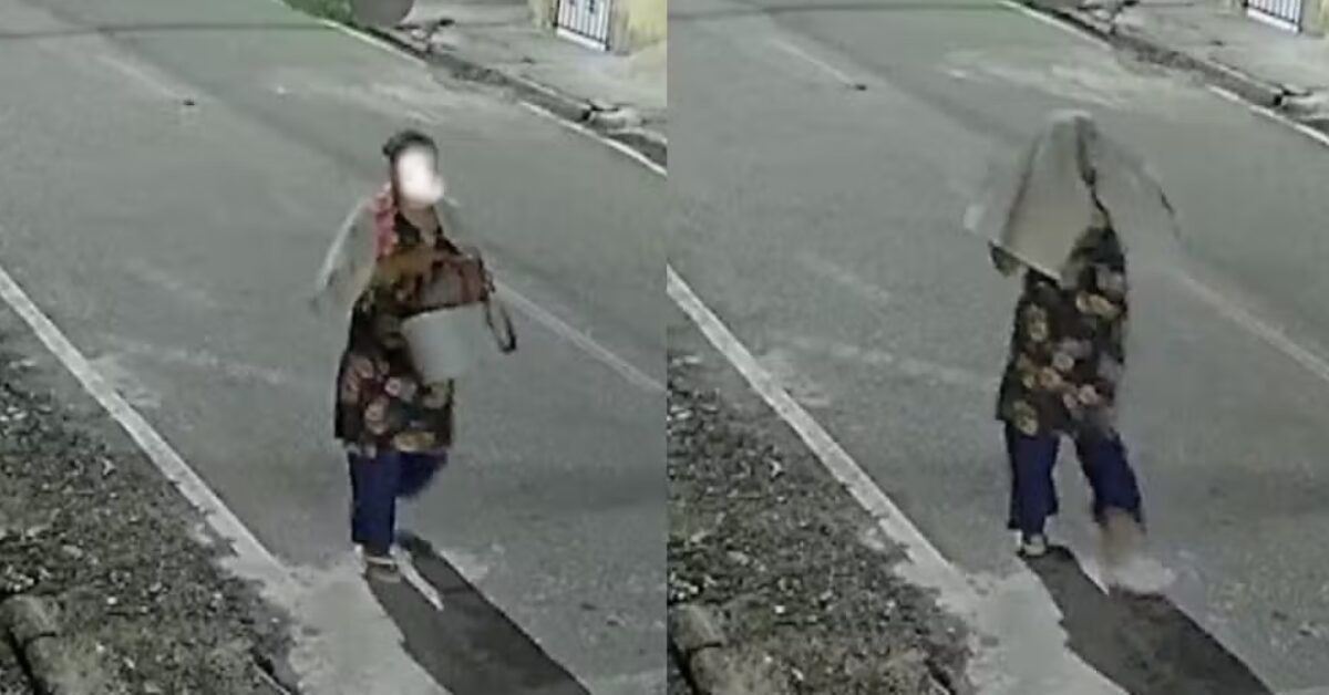 As imagens mostram a mulher caminhando com um balde que continha uma mochila. De acordo com a Polícia Civil, dentro da mochila estava a bebê, que ainda tinha o cordão umbilical. Minutos depois, a mulher retorna ao local sem os objetos.