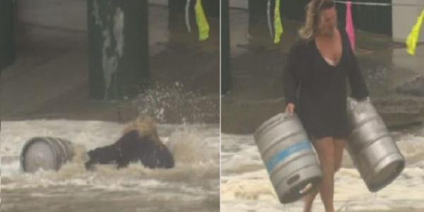Uma mulher enfrentou uma tempestade para resgatar algo bastante importante pra ela: dois barris de cerveja que estavam sendo levados pela enchente do mar. A situação inusitada foi registrada ao longo de Gold Coast, em Queensland, na Austrália, na manhã de segunda-feira (14), quando uma tempestade fez com que a maré subisse tanto que inundasse as ruas próximas da praia.