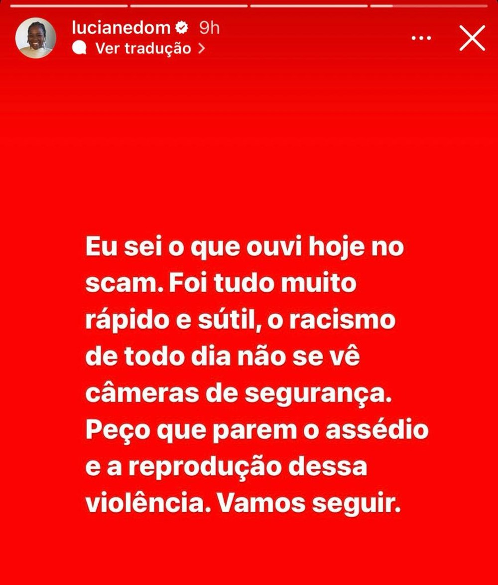 Com a publicação excluída de seu perfil, Luciane usou os stories do Instagram para se manifestar. “Eu sei o que ouvi hoje (quinta-feira) no scam. Foi tudo muito rápido e sutil, o racismo de cada dia não se vê (por) câmeras de segurança”, afirmou a cantora, que completou com um apelo: “Peço que parem o assédio e a reprodução dessa violência”.