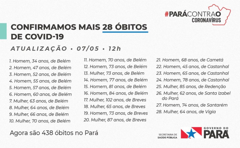No primeiro dia do lockdown em Belém e Região Metropolitana, a Secretaria de Estado de Saúde (Sespa-PA) informou, em boletim oficial divulgado às 13 horas desta quinta-feira, 27, que mais 28 pessoas morreram no estado do Pará, vítimas de Covid-19. Agora são 438 óbitos em todo o estado do Pará.