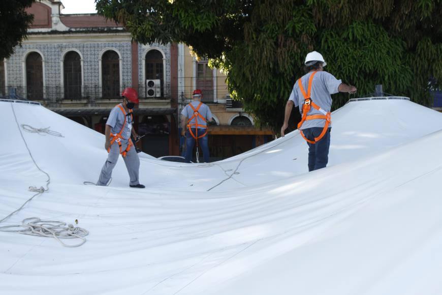 Neste domingo, 7, uma equipe técnica da Prefeitura de Belém acompanhou de perto a etapa de tensionamento e teste de resistência das novas lonas do mercado do Ver-o-Peso, após a substituição do material que sofreu danos por atos de vandalismo. Para realizar o serviço, os funcionários da empresa responsável pela fabricação e instalação da lona trabalhavam andando sobre ela, mostrando a resistência ao peso.