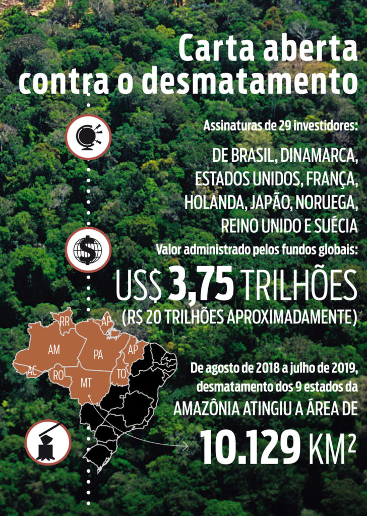 Um grupo de investidores internacionais cuja carteira de ativos soma US$ 3,75 trilhões (cerca de R$ 20 trilhões) enviou uma carta aberta às embaixadas brasileiras de oito países para pressionar o governo a conter o desmatamento na Amazônia. O documento foi assinado por 29 investidores institucionais de Estados Unidos, Noruega, Suécia, Dinamarca, Reino Unido, França, Holanda, Japão e Brasil. “Estamos preocupados com o impacto financeiro que o desmatamento e a violação dos direitos de povos indígenas podem ter sobre nossos clientes e companhias investidas, por potencialmente elevarem os riscos de reputação, operacional e regulatório”, diz a carta. Para os signatários, o temor é de que empresas expostas em suas operações no Brasil e cadeias de fornecedores enfrentem dificuldades crescentes para acessar os mercados internacionais.