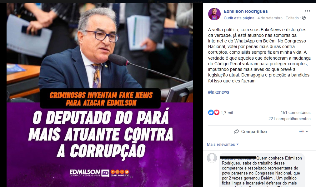 O deputado Edmilson Rodrigues (PSOL), o mesmo que saia gritando Lula Livre com o petista condenado com provas pelo TRF-4, enquanto atacava a operação Lava jato e o juiz Sérgio Moro, quer usar as “Fake News” para se esconder depois de ter votado contra aumento de pena para crimes de desvios e corrupção durante a pandemia.