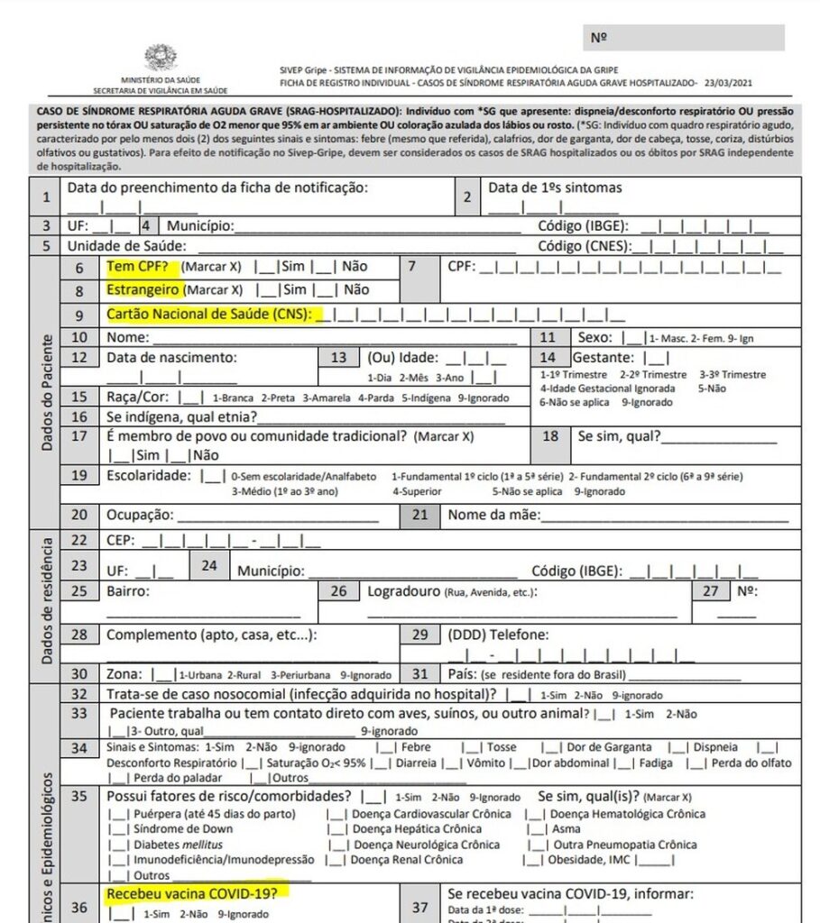 Sivep-Gripe – A ficha do Sivep-Gripe é válida para todos os hospitais e vigilâncias municipais do país. A ficha do paciente vai sendo preenchida conforme o ele evolui e novas informações são obtidas – como o resultado de exames, a necessidade de internação em Unidade de Terapia Intensiva (UTI) ou de ventilação mecânica, além da data da alta ou do óbito.