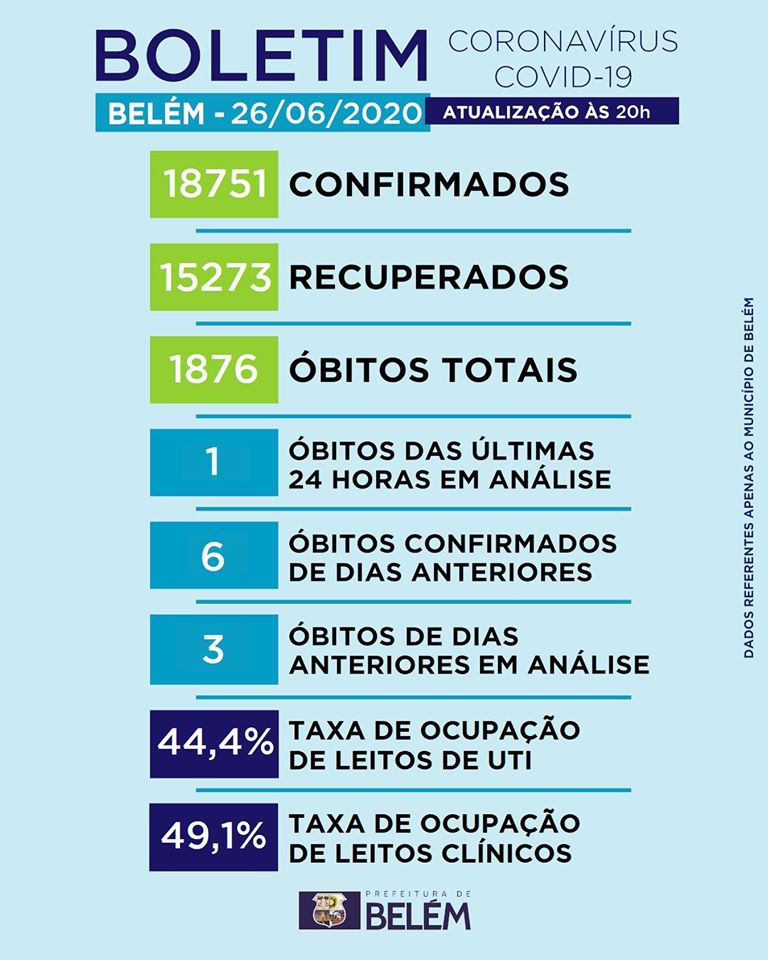 Dados municipais – Belém tem 18.751 casos confirmados da doença. Destes, 15.273 pacientes já estão recuperados. 1.876 vieram a óbitos.